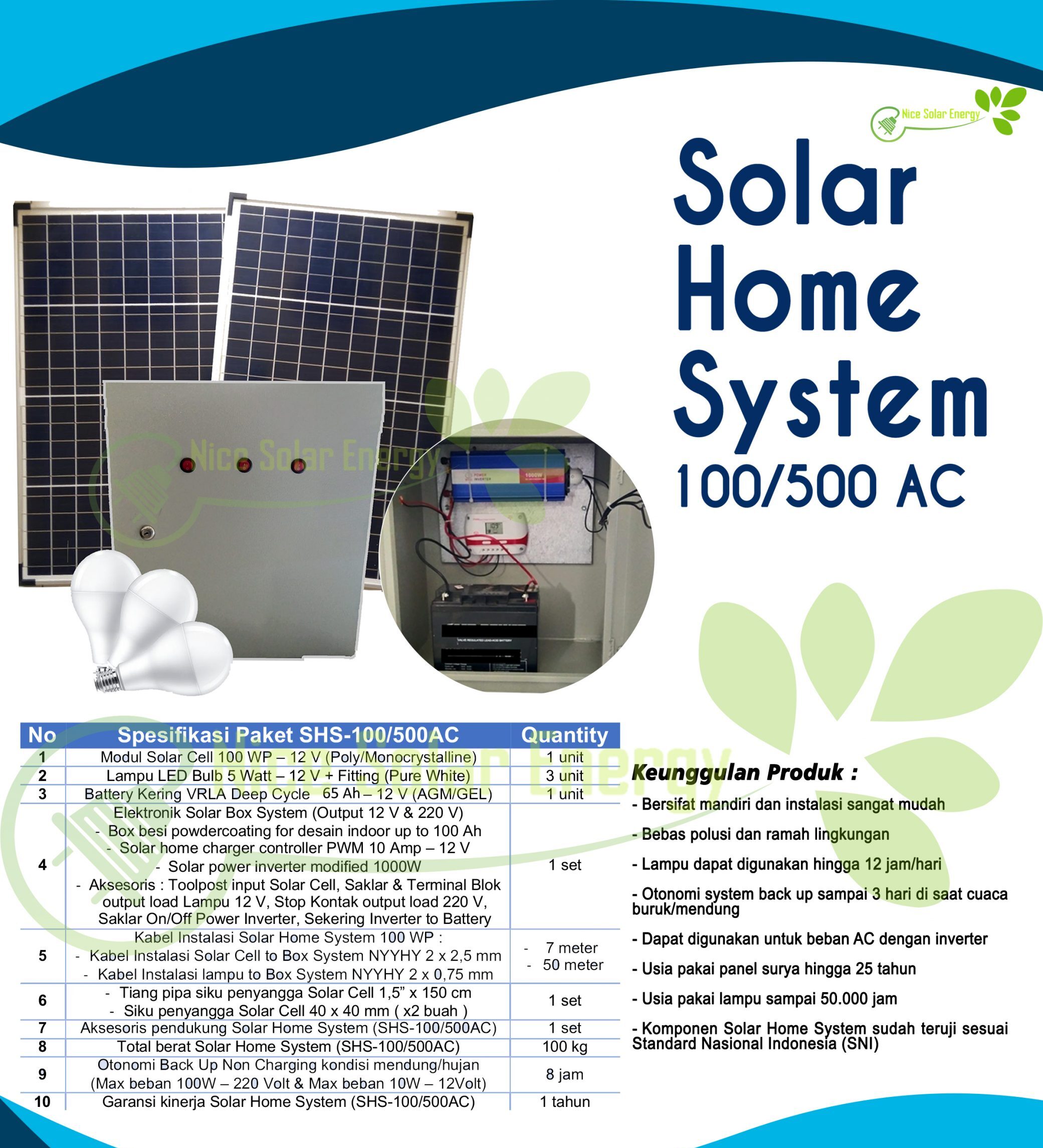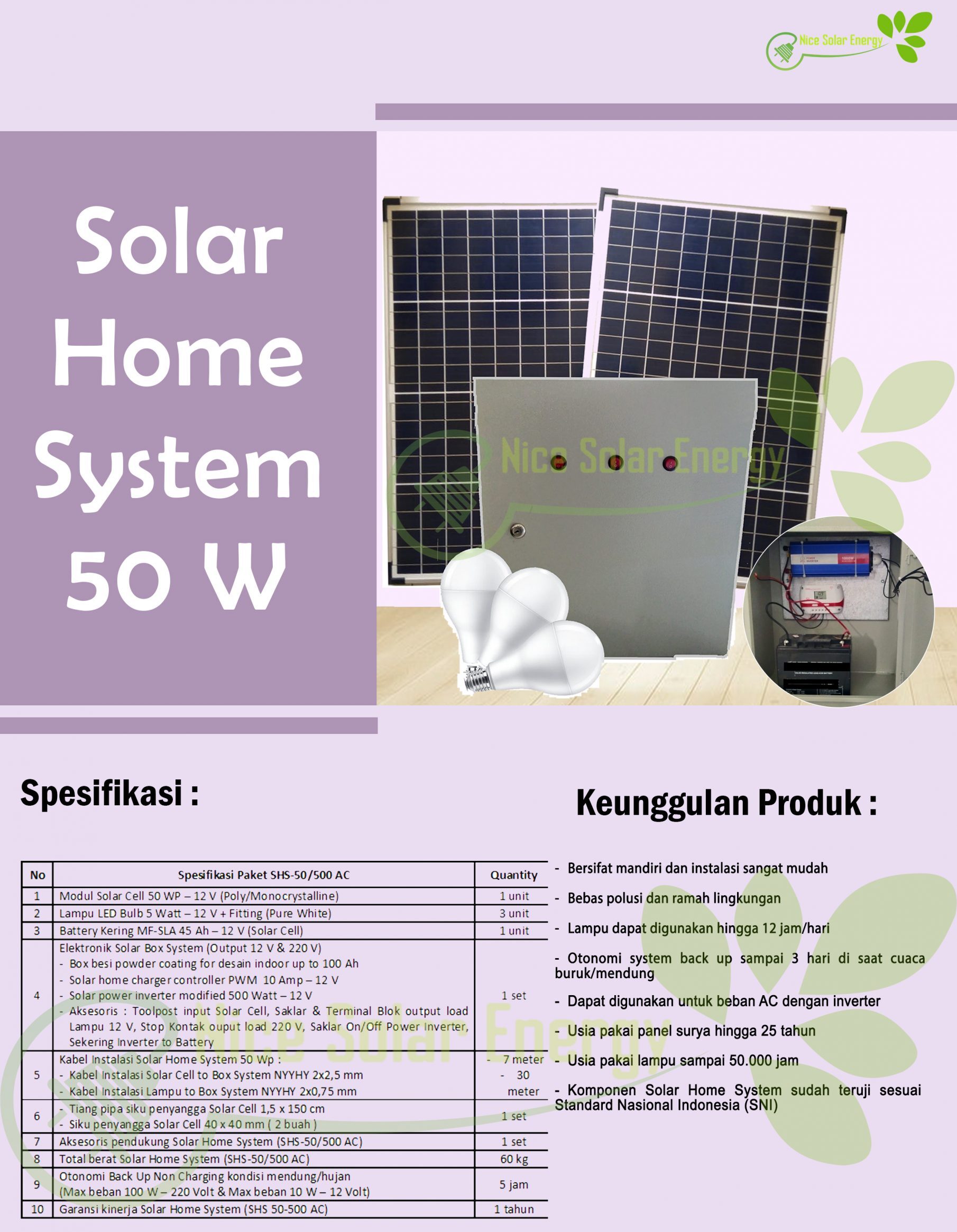 Sebelumnya Selanjutnya KEUNGGULAN PRODUK– Bersifat mandiri. dapat dipasang perumah-rumah warga– Murni 100% energi yang dihasilkan dari sinar matahari– Kapasitas dapat disesuaikan dengan kebutuhan perhari– Mudah